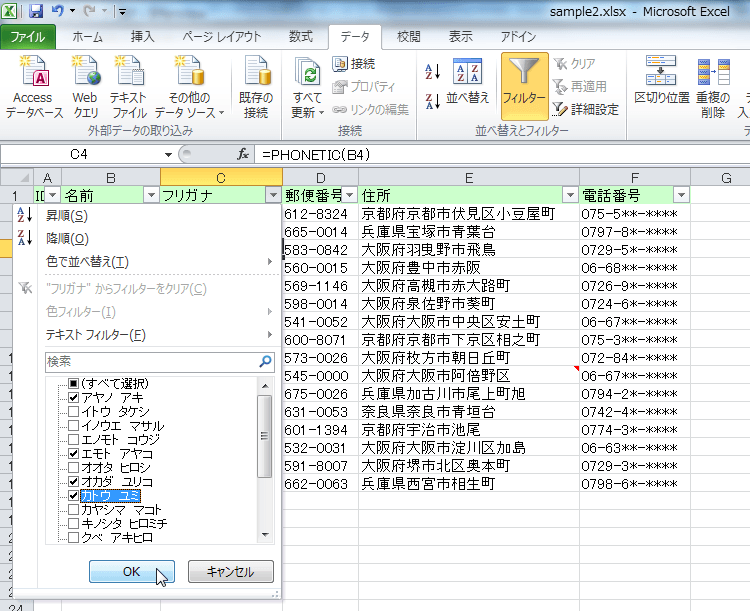 オートフィルターの列見出しボタンをクリックして、表示したいデータだけを選択できます。