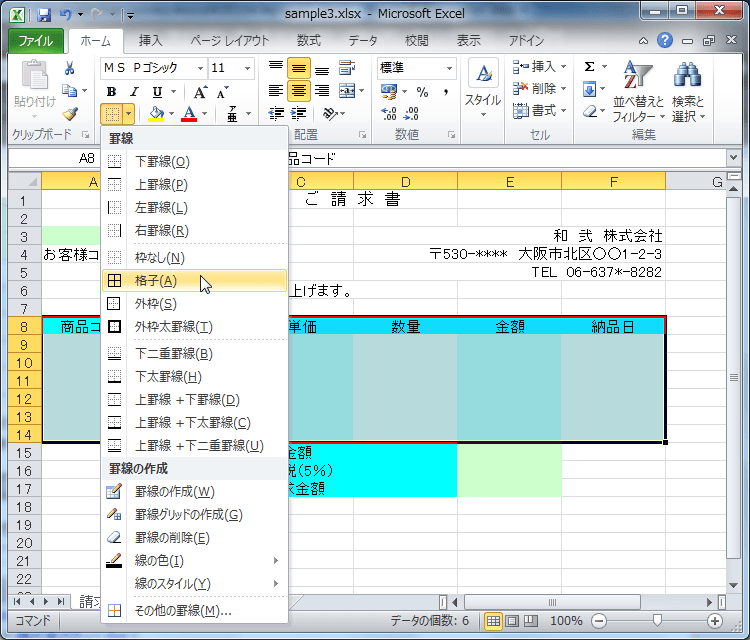 - [ホーム]タブの[罫線]ボタンの▼をクリックして、一覧から[格子]を選択します。