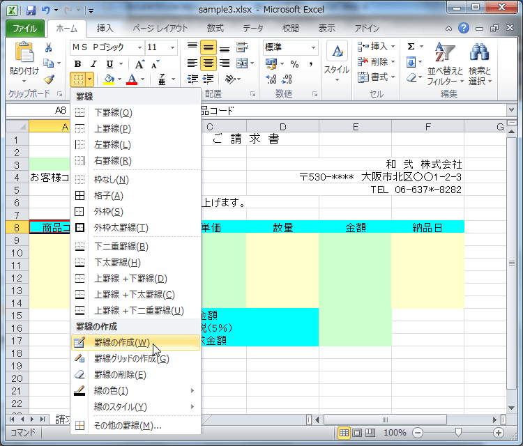 罫線ボタンを利用してセルに罫線をつける