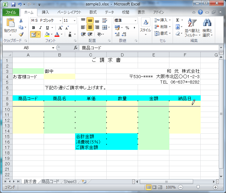 | 8 | 商品コード | 商品名 | 単価 | 数量 | 金額 | 納品日 |