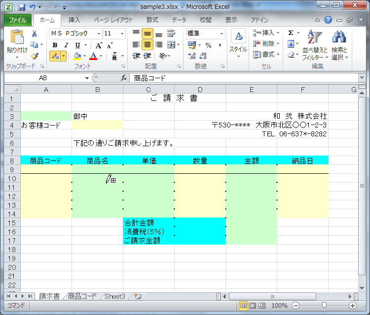 | 4 | お客様コード | 〒530-**** 大阪市北区○○1-2-3 | ||||