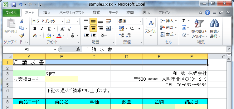 | 4 | お客様コード | 〒530-**** 大阪市北区○○1-2-3 | ||||
