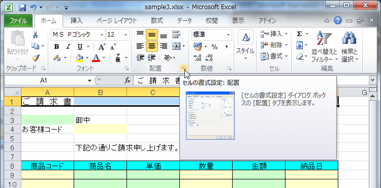 「ご請求書」などの文字を全体の中央に配置するには、Wordでは簡単ですが、Excelでは複数のセルを指定して中央揃えにする必要があります。一番手っ取り早い方法としては、[セルを結合して中央揃え]ボタンを利用することです。