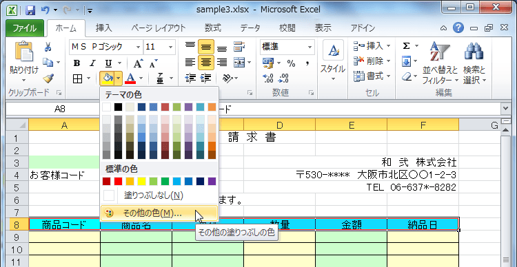 - [塗りつぶしの色]の▼をクリックして[その他の色]をクリックします。