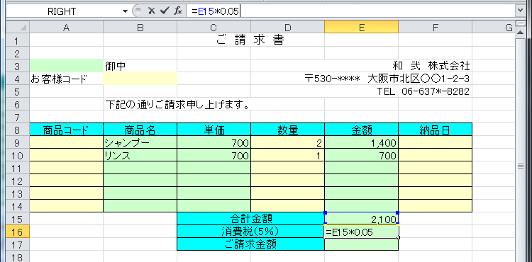 では、最後に消費税5%と請求金額を求めましょう。