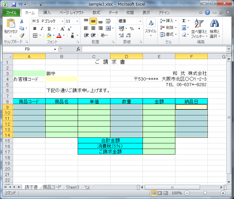 | 4 | お客様コード | 〒530-**** 大阪市北区○○1-2-3 | ||||
