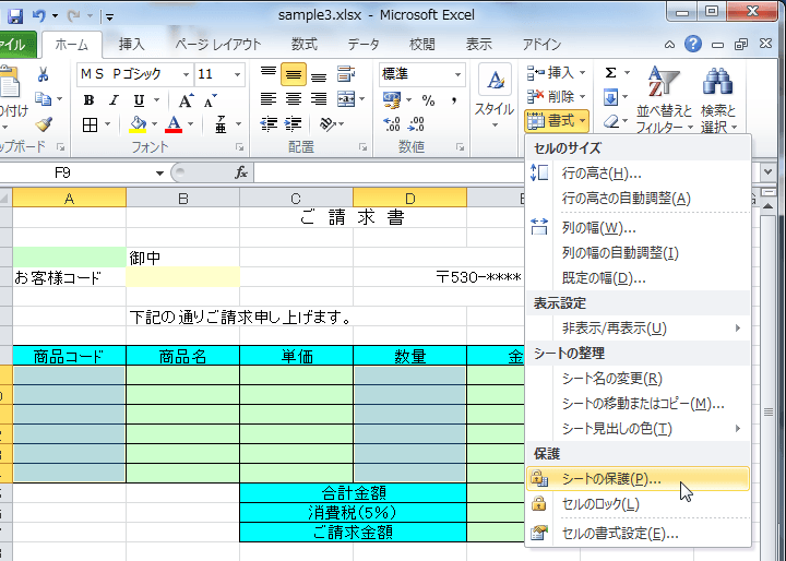 - [ホーム]タブの[セル]の[書式]をクリックして、[シートの保護]をクリックします。