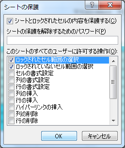 既定では、「ロックされたセル範囲の選択」および「ロックされていないセル範囲の選択」が許可されています。許可する操作のオプションは以下の通りです。