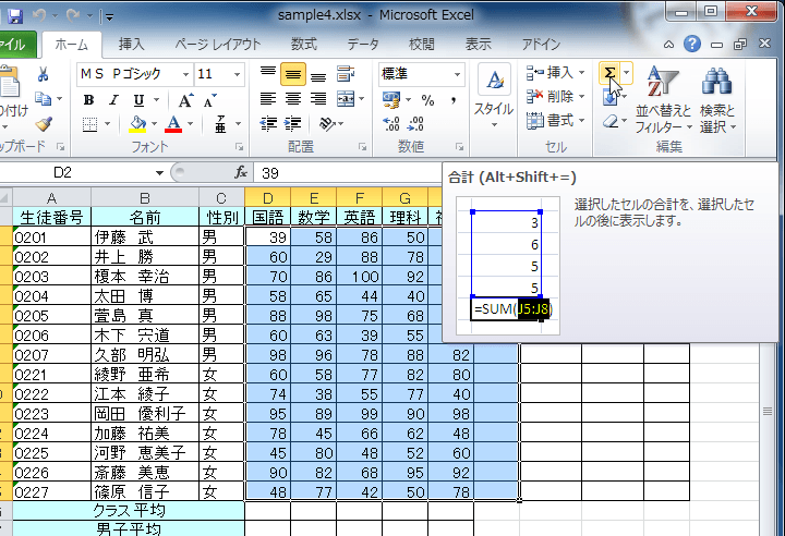 合計の対象となるデータを含んだすべてのセルを選択し、オートSUMボタンをクリックすることで求められます。