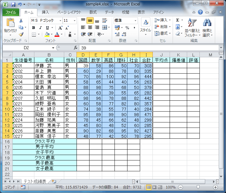 | 1 | 生徒番号 | 名前 | 性別 | 国語 | 数学 | 英語 | 理科 | 社会 | 合計 | 平均点 | 偏差値 | 評価 |