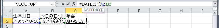 =DATEDIF(と入力します。 - 生年月日セル(A2)を選択して