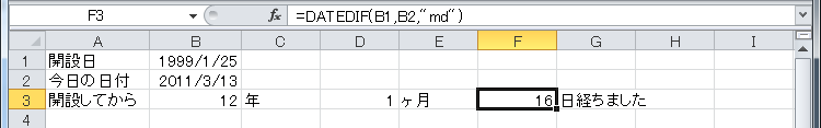 記念日からの経過年月日数をそれぞれ求めるには、DATEDIF関数の単位を指定することで求められます。