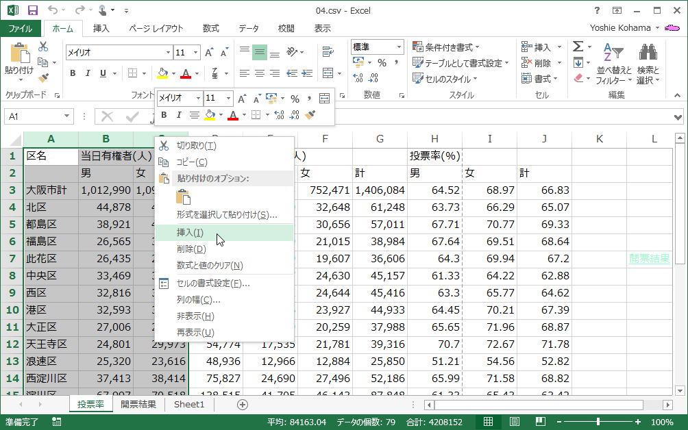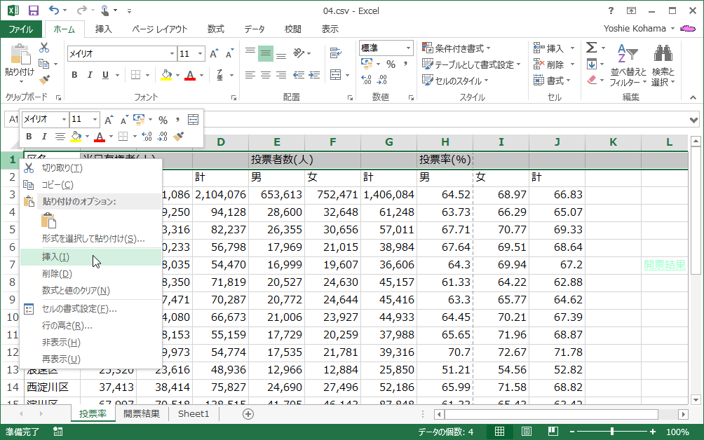 列や行を挿入したい列番号または行番号を右クリックしてショートカットメニューより[挿入]を選択するとOKです。なお、複数行または複数列を選択して、右クリックしてショートカットメニューより[挿入]を選択するとその複数行や複数列分挿入されます。一方、列や行を削除するには、対象となる列全体や行全体を選択して右クリックし、ショートカットメニューより[削除]を選択します。