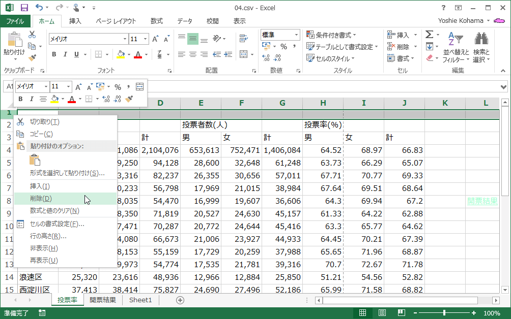 - 一方、列を削除するには、削除したい列全体を選択して右クリックし、ショートカットメニューより[削除]をクリックするとOKです。