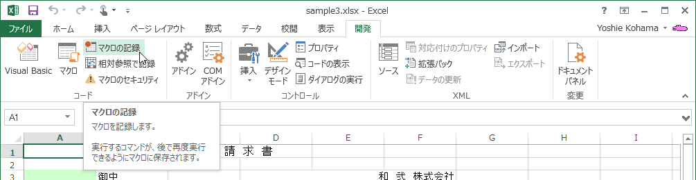 - [開発]タブを開き、[マクロの記録]をクリックします。