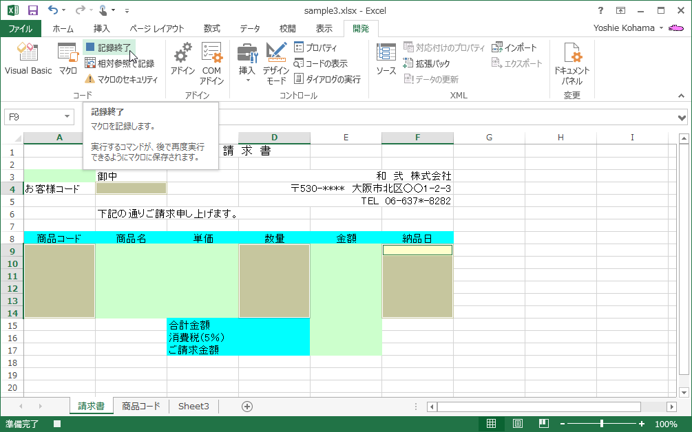 - 操作が終わったら、[開発]タブの[記録終了]をクリックします。