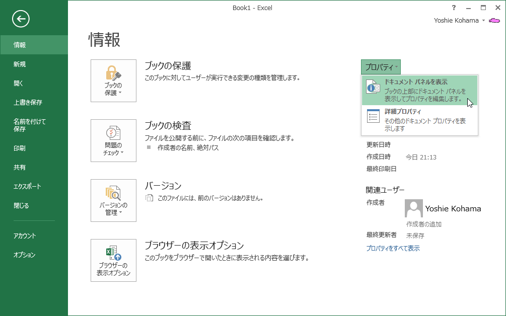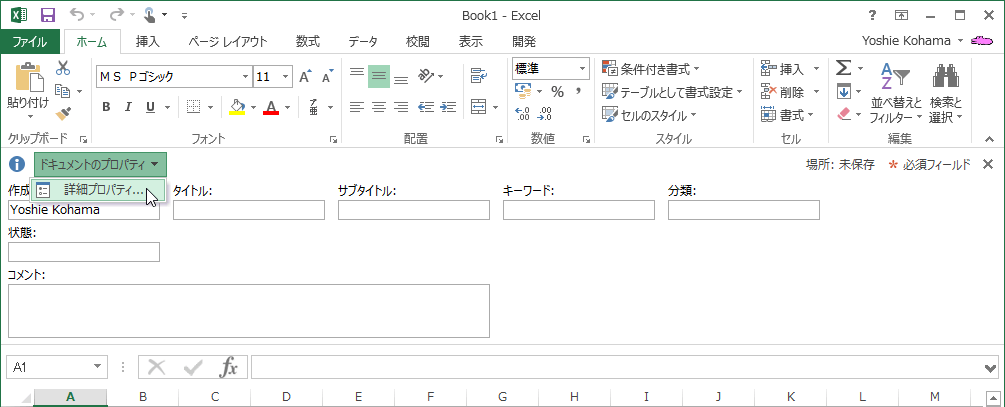 [ファイル]タブを開き、[情報]画面の右側の[プロパティ▼]を選択して、ドキュメントパネル、または詳細プロパティのいずれかを選択し、プロパティに値を追加します。