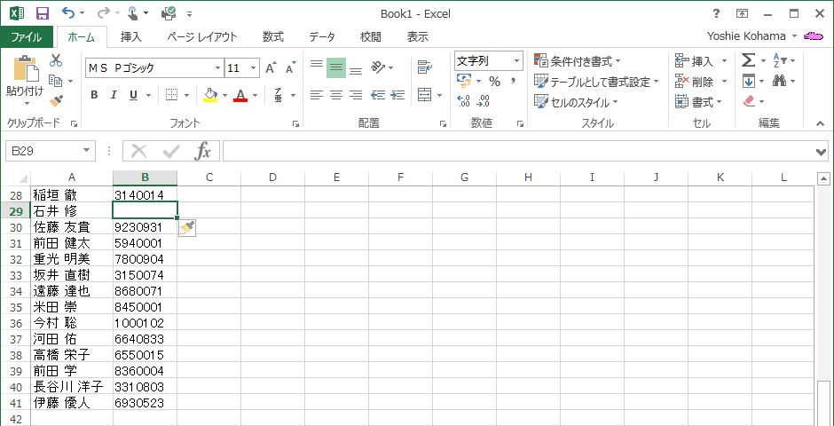 データを入力していくと、誤って一つデータ入力を飛ばしてしまってずれてしまうことがあります。そんなときは、抜けてしまったところにセルを挿入するとよいでしょう。挿入すべき場所のセルを選択して、[ホーム]タブの[セル]グループの[挿入]コマンド一覧から[セルの挿入]を選択し、[下方向にシフト]を選択します。ショートカットキーはCtrl+Shift+=です。