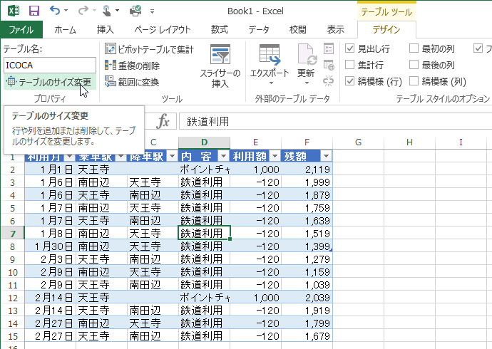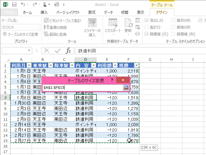 下にデータを追加すると自動的にテーブルのサイズを変更できます。後でほかのワークシートのデータと連結するには、つなげたいセルとの空白行を削除して、既存のテーブル内にカーソルを移動し、[テーブルツール]の[デザイン]タブの[テーブルのサイズ変更]をクリックし、テーブルのサイズを指定します。