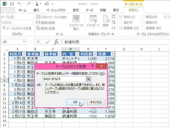 - [テーブルのサイズ変更]ダイアログボックスの[OK]ボタンをクリックします。