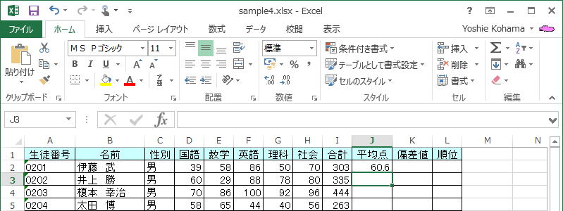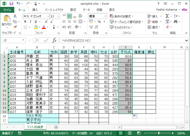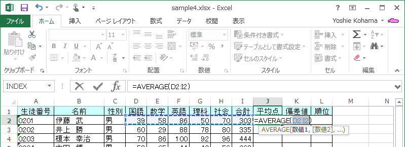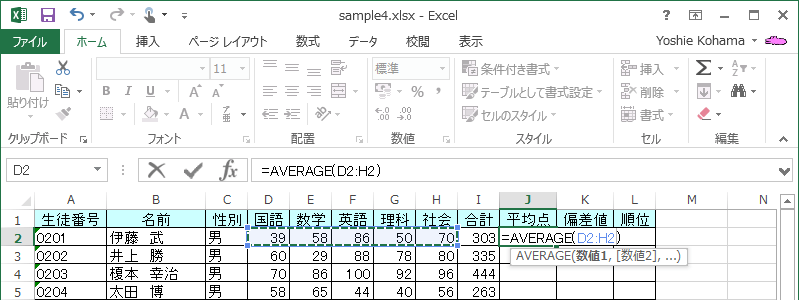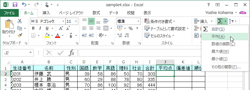- J2セルを選択し、オートSUMボタンの▼をクリックして[平均]をクリックします。