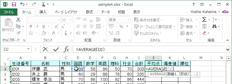 - Enterキーを押すと、平均値が求められました。Enterキーを押すと