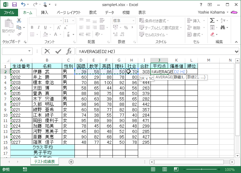 - 合計セルまで対象となっているので、正しく範囲指定します。国語(D2)から社会(H2)の点数セルまでドラッグして指定します。はじめは合計セルまで範囲指定される