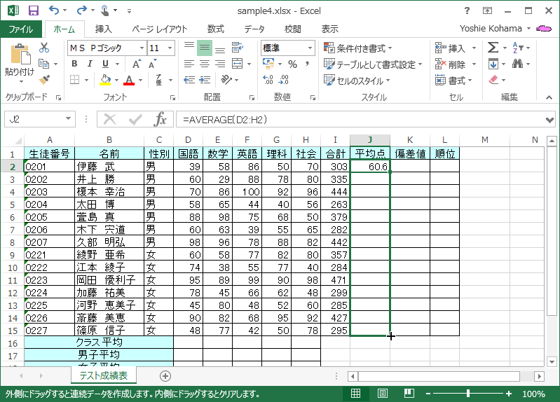 - 平均値が求められたセルを選択し、フィルハンドルで下の方までドラッグします。