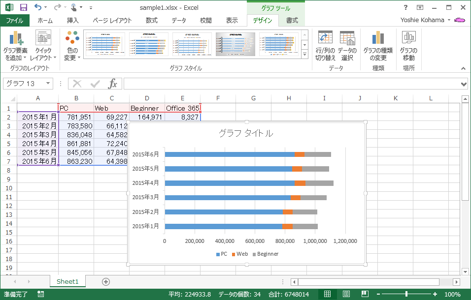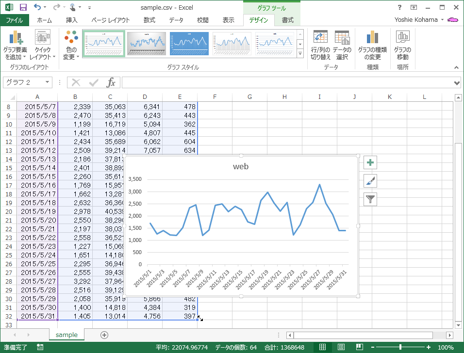 - データ範囲の大きさが変更され、グラフが連動して更新されました。