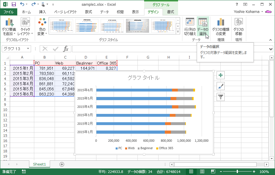 グラフのデータ範囲の大きさを変更するには、グラフを選択して、元データ範囲の右下隅をドラッグするとOKです。なお、データ系列を追加するには[グラフツール]の[デザイン]タブを開き、[データ]グループの[データの選択]をクリックして、[データソースの選択]ダイアログボックスを表示し、そこで系列や項目の追加や削除、および非表示等が行えます。