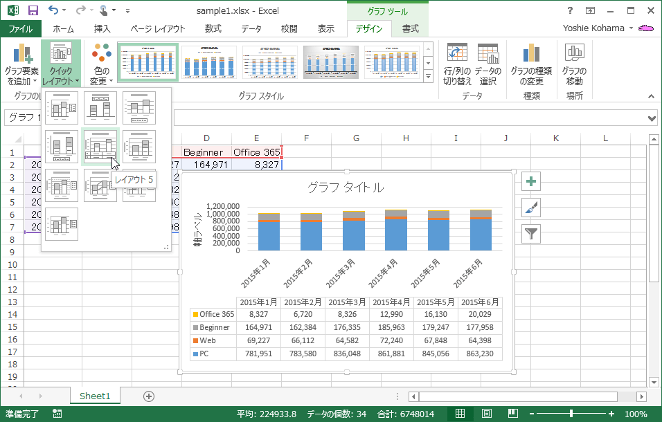クイックレイアウトを使用すると、グラフのレイアウトを素早く変更できます。グラフを選択して[グラフツール]の[デザイン]タブを開き、[クイックレイアウト]一覧よりレイアウトを選択します。