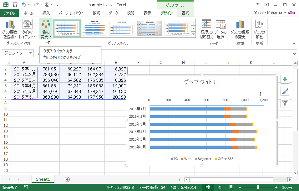 - [グラフスタイル]グループの[色の変更]を選択します。