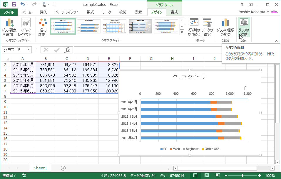 - グラフを選択して[グラフツール]の[デザイン]タブを開き、[グラフの移動]をクリックします。
