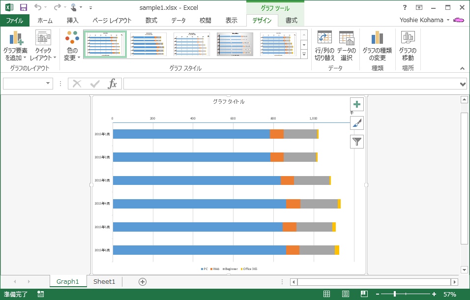 既定ではチャートやグラフはシート内のオブジェクトとして配置されますが、シートに移動することもできます。グラフを選択して[グラフツール]の[デザイン]タブを開き、[グラフの移動]から[新しいシート]または[オブジェクト]を選択します。