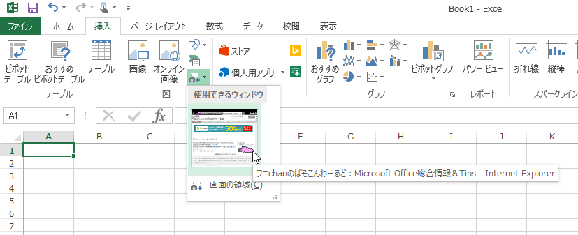 - [挿入]タブを開き、[画像]グループの[スクリーンショット]をクリックします。
