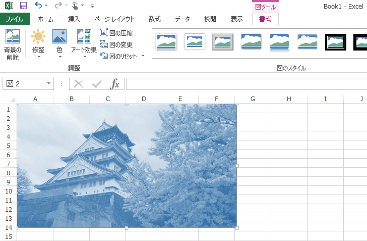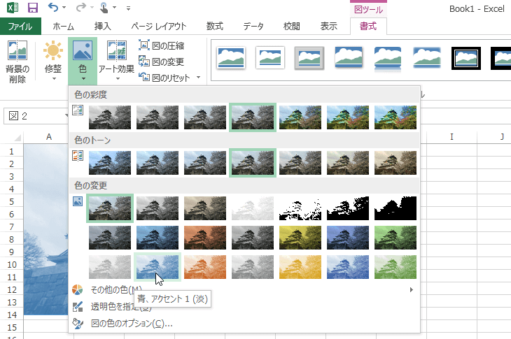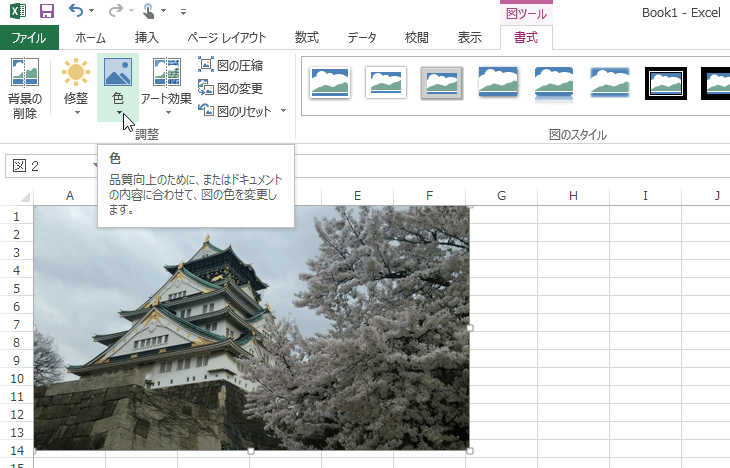 - 図を選択して[図ツール]の[書式]タブ内の[色]をクリックします。