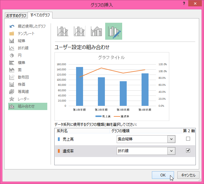 - [グラフの挿入]ダイアログボックスの[組み合わせ]タブが選択されていることを確認します。