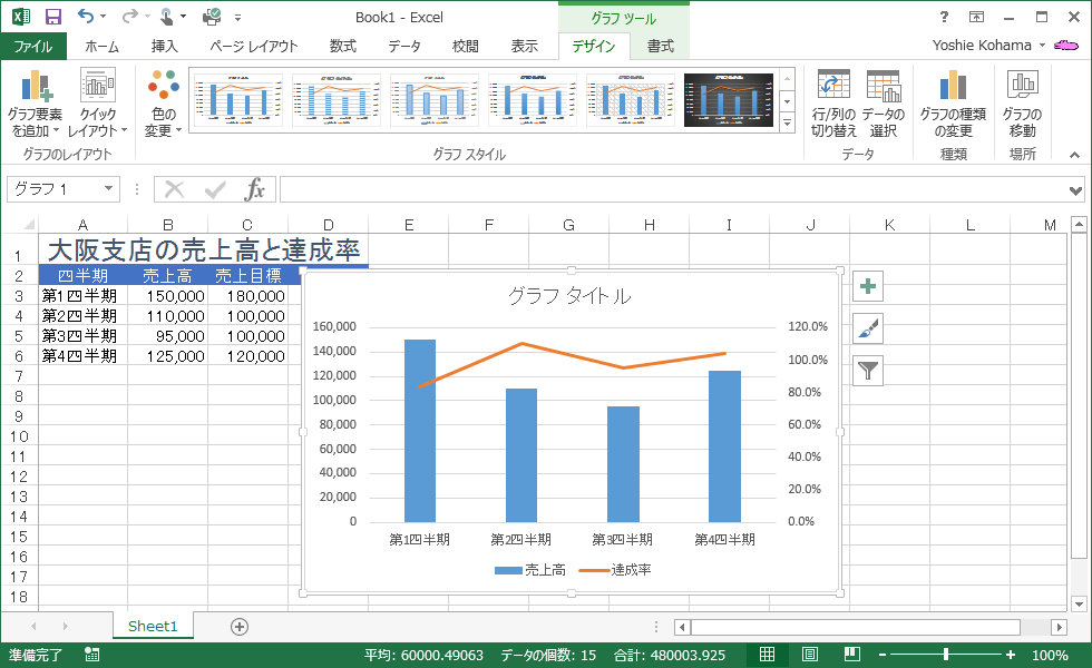 - 複合グラフを選択し、[デザイン]タブを開きます。