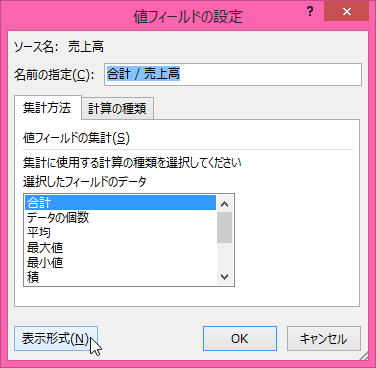 - [値フィールドの設定]ダイアログボックスの[表示形式]ボタンをクリックします。