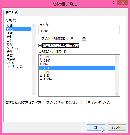 - [セルの書式設定]ダイアログボックスから希望する表示形式を選択して[OK]ボタンをクリックします。