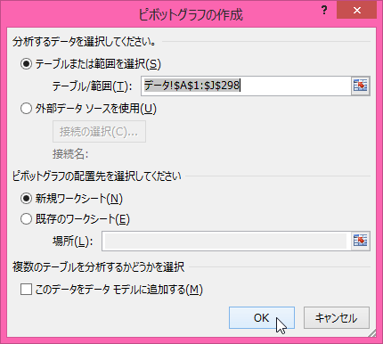 - [テーブル/範囲]には[データ!$A$1:$J$298]と表示されていることを確認します。