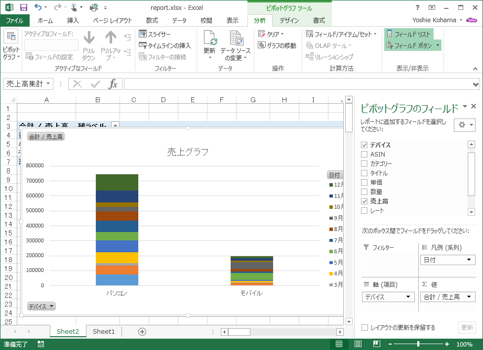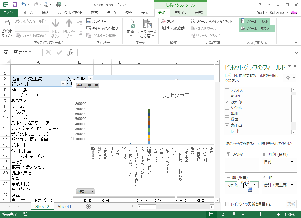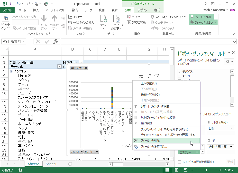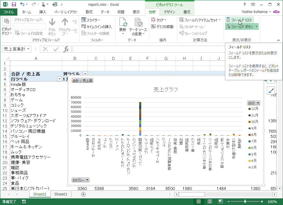 [ピボットグラフのフィールド]作業ウィンドウを使用して、後でフィールドを自由に追加または削除ができます。[ピボットグラフのフィールド]作業ウィンドウを表示するには、ピボットグラフを選択し、[分析]タブの[表示/非表示]グループの[フィールドリスト]をクリックします。