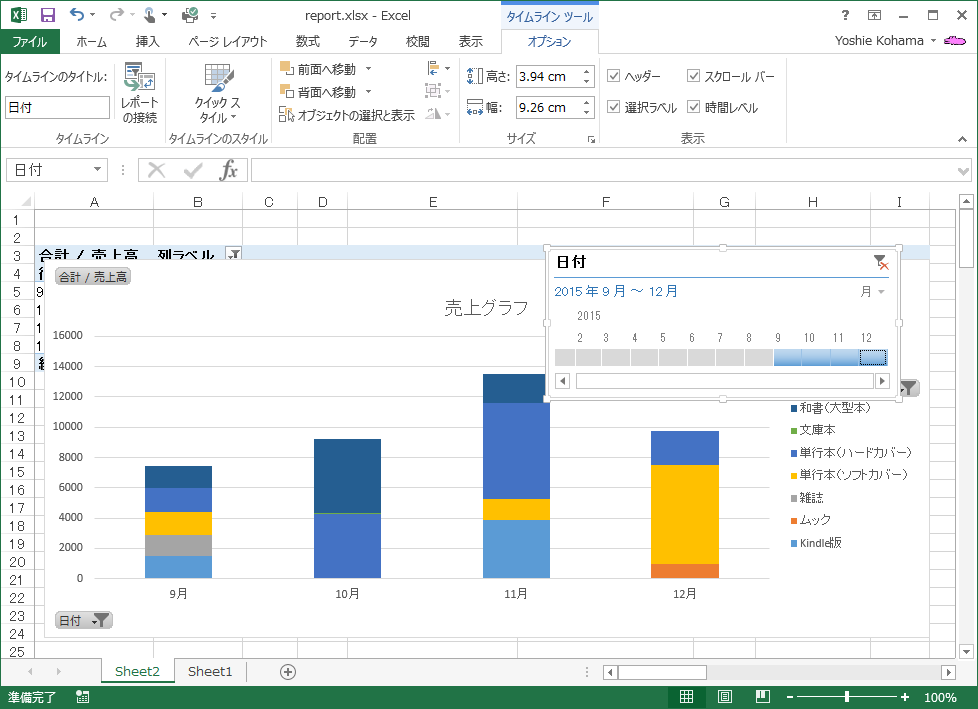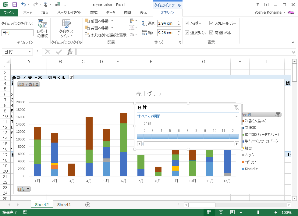 タイムラインを使ってピボットグラフのデータの絞り込みを行うには
