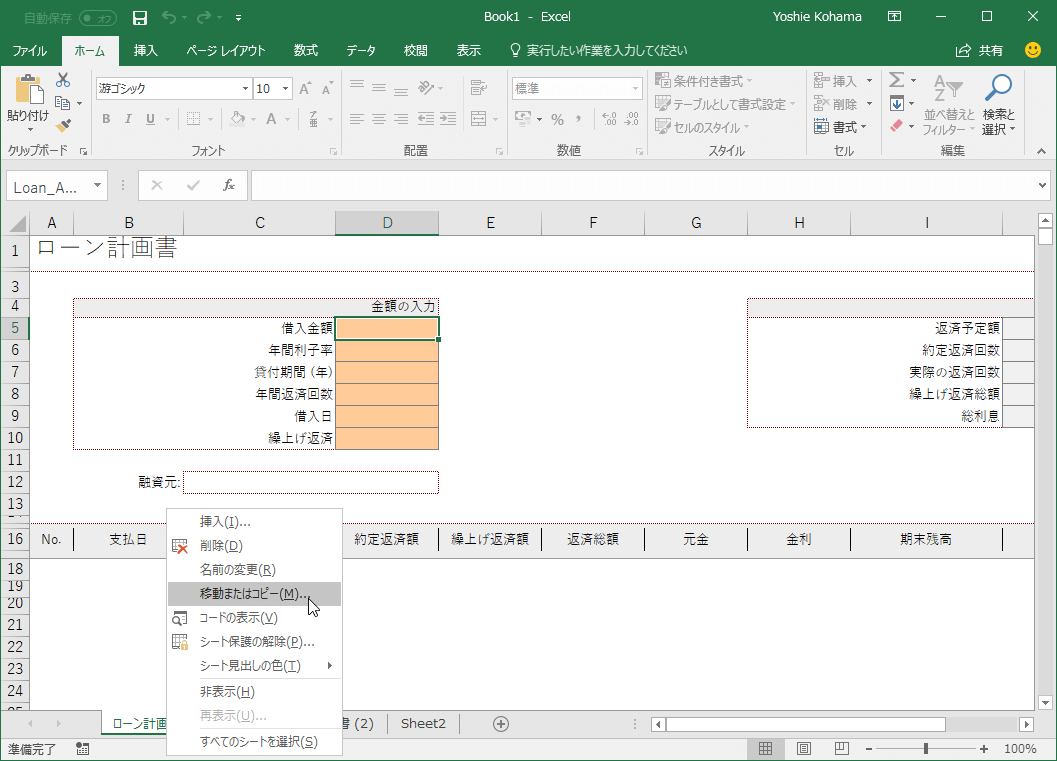 ブック内でシートのコピーまたは移動するには