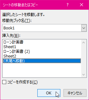 - [シートの移動またはコピー]ダイアログの一覧から[(末尾へ移動)]を選択します。