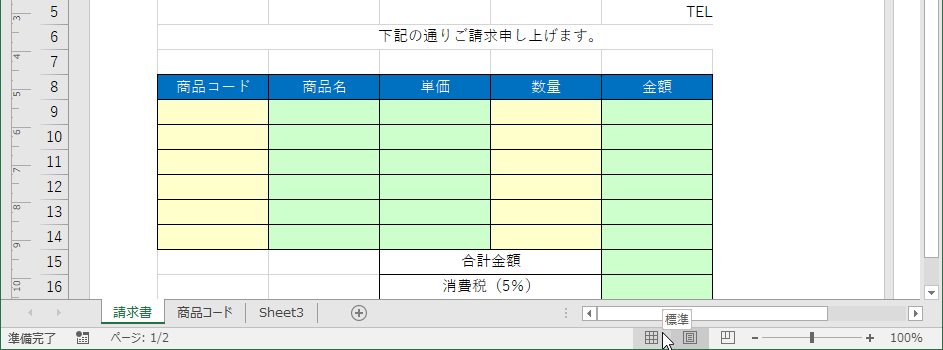 - [表示]タブの[ブックの表示]グループの[標準]を選択