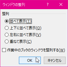 - [ウィンドウの整列]ダイアログボックスから[並べて表示]または[左右に並べて表示]を選択します。