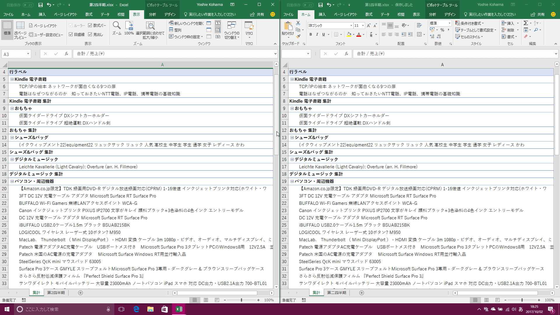 例えば、過去のデータファイルと比較したい場合、Excelで[並べて比較]機能を利用して、二つのブックを同時にスクロールされ、簡単に比較することができます。両方のブックをあらかじめ開いておき、[表示]タブを開き、[ウィンドウ]グループの[並べて比較]をクリックします。最初は上下に並べて表示されますが、左右に並べたい場合は、その後[表示]タブの[ウィンドウ]グループの[整列]を選択して、[ウィンドウの整列]ダイアログボックスから[並べて表示]または[左右に並べて表示]を選択します。