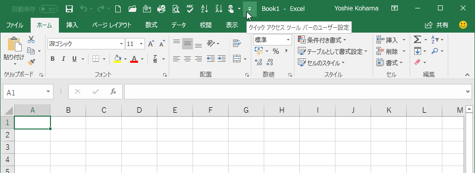 Excel 2016のクイックアクセスツールバーは既定ではタイトルバーの左側に配置されていますが、リボンの下に移動することもできます。リボンの下に移動することで、クイックアクセスツールバーに追加できるコマンドボタンをたくさん増やせます。クイックアクセスツールバーの右側▼をクリックし、クイックアクセスツールバーのカスタマイズメニューより[リボンの下に表示]を選択します。