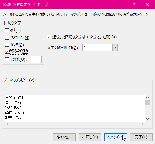 - 半角スペースで区切られたデータの場合は、以下のように[スペース]にチェックを付けて[次へ]ボタンをクリックします。